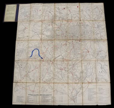 Condition: The map is in fair condition, some markings and stains to the surface as well as some later coloured pen annotations, losses to lower edge, card covers are worn, missing outer label,