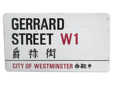 An enamelled iron street sign for Gerrard Street W1 Chinatown, City of Westminster