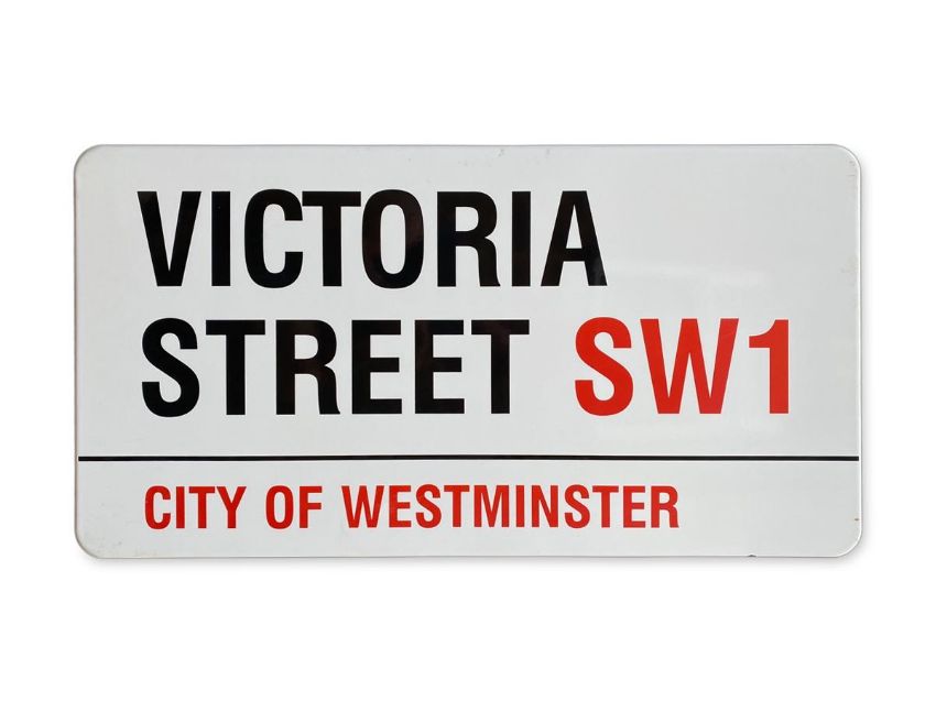 An enamelled iron street sign for Victoria Street SW1, City of Westminster