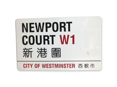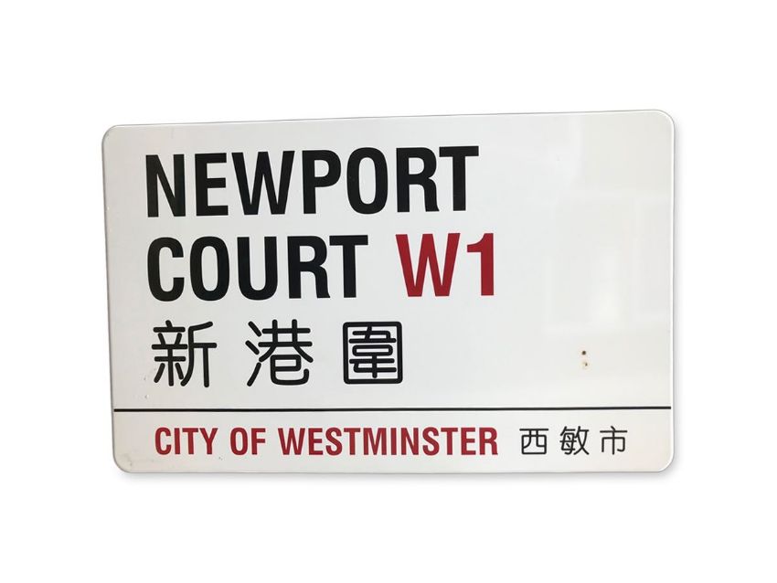 An enamelled iron street sign for Newport Court W1 Chinatown, City of Westminster