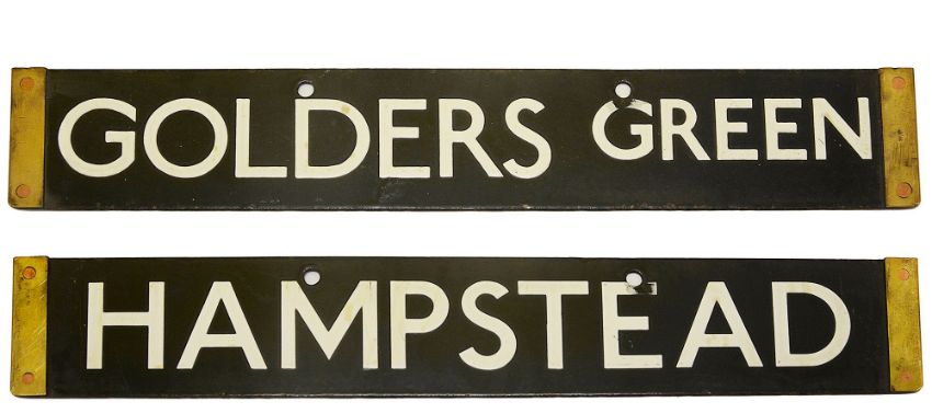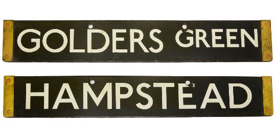 A London Underground 1938 Tube Stock enamel cab destination plate for GOLDERS GREEN / HAMPSTEAD,
