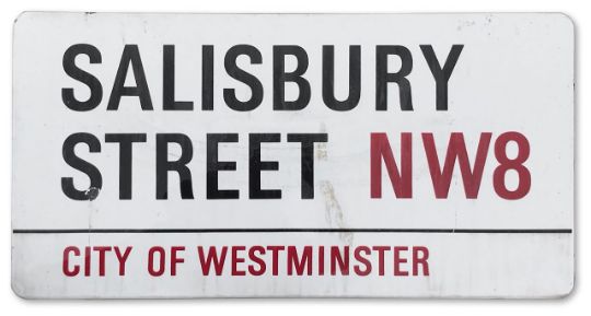 An enamelled iron street sign for Salisbury Street NW8, City of Westminster with iconic black and red sans serif lettering first created by Sir Misha Black in 1967 which is unique to the Westminster signs and under copyright law, forbidden to be copied anywhere else in the world, sold together with a signed Certificate of Authenticity