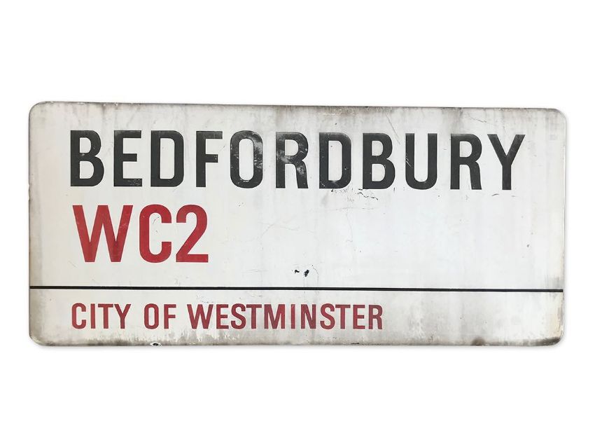 An enamelled iron street sign for Bedfordbury WC2, City of Westminster