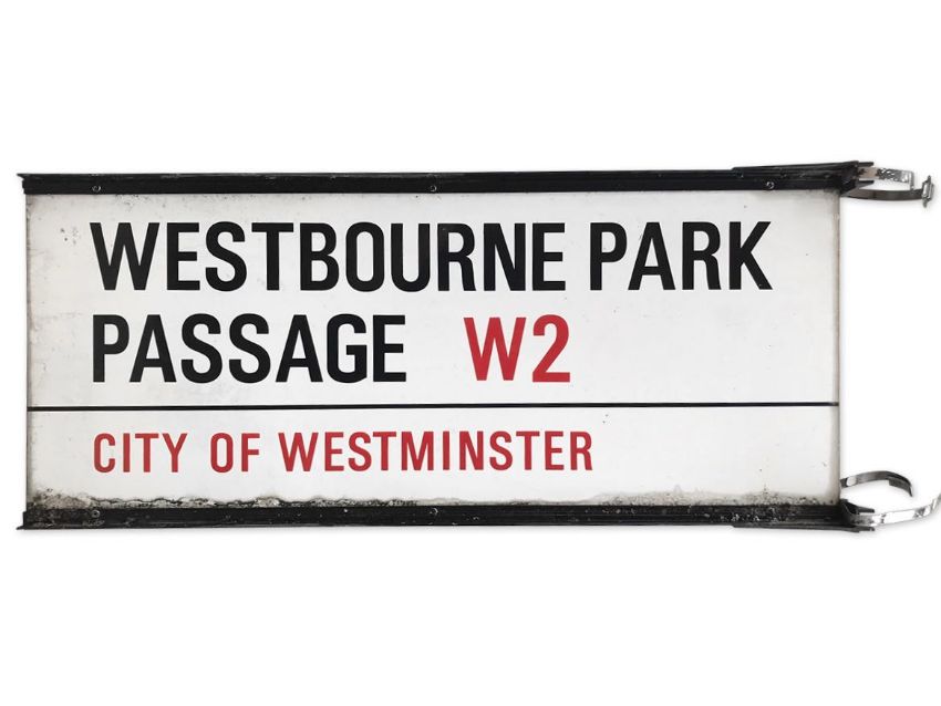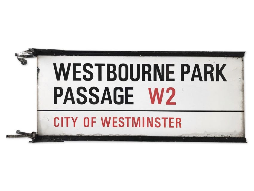 A double sided enamelled iron street sign on brackets for Westbourne Park Passage W2, City of Westminster