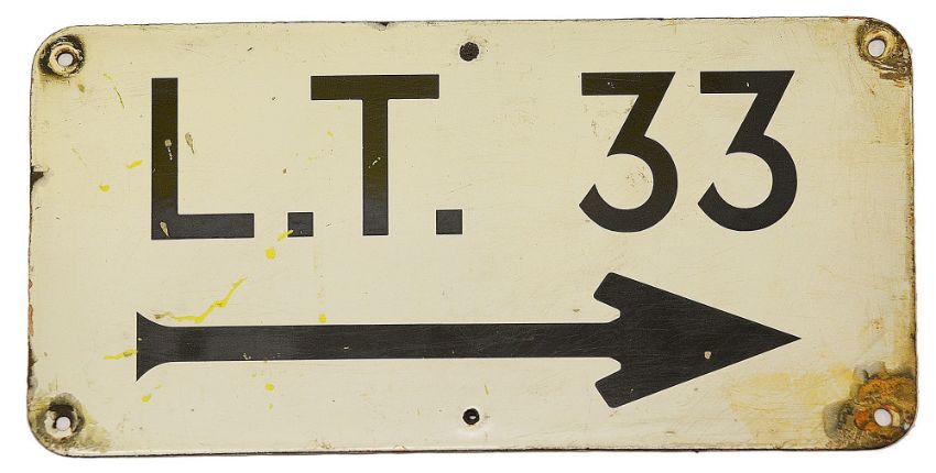 An enamel directional sign displaying 'L.T. 33',
