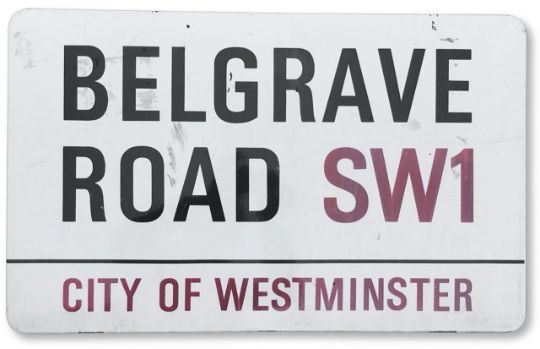 An enamelled iron street sign for Belgrave Road SW1, City of Westminster, with iconic and black and red sans serif lettering first created by Sir Misha Black in 1967 which is unique to the Westminster signs and under copyright law, forbidden to be copied anywhere else in the world, sold together with a signed Certificate of Authenticity