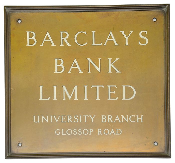 from a Sheffield branch, inscribed with 'UNIVERSITY BRANCH / GLOSSOP ROAD', inside a reeded moulded border with four drilled holes for mounting