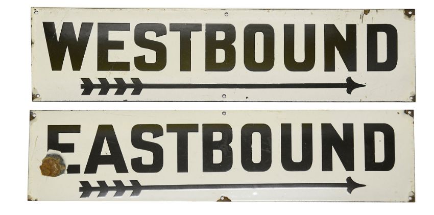 Two early 20th century railway station enamel directional signs displaying 'WESTBOUND' and 'EASTBOUND',