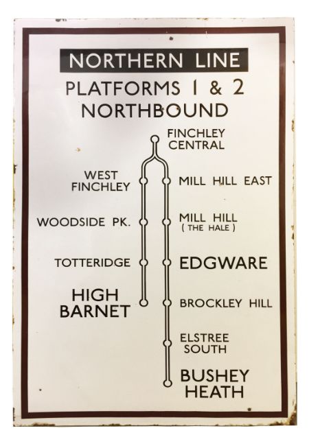 Condition: losses to enamel above West Finchley and Mill Hill East station, corrosion around screw eyelets above 'Northbound' and abover 'Northern Line', corners rusting and corrosion to edges, other surface marks and streaks, extremely heavy