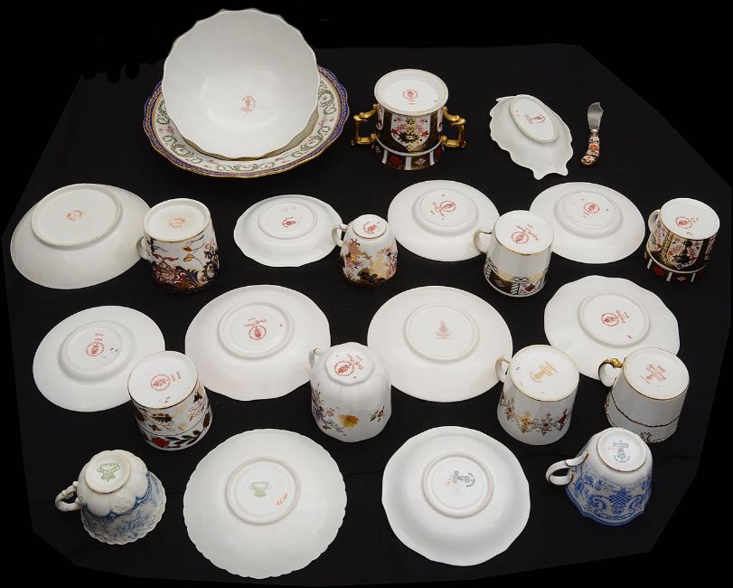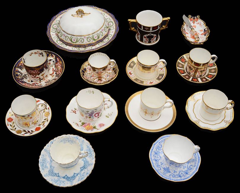 A collection of Royal Crown Derby coffee cups and saucers to include muffin dish and coverthe muffin dish and cover, pattern 6730 retailed by T. Goode & Co., a twin handled Imari loving cup, 1128, an Imari butter dish Rd No 345784, an Imari handled knife, a Bloor Derby Imari coffee can and saucer, other cups and saucer in Lombardy, Derby Posies, Derby Border, pattern 4203 and Imari 1128 and 8687, 3788 patterns etc., (qty)various Condition: Derby Border, 1128 Imari have seconds scratch marks. One cup and saucer is Aynsley. The Cherboug pattern can is with a Doulton saucer. Otherwise condition is good.