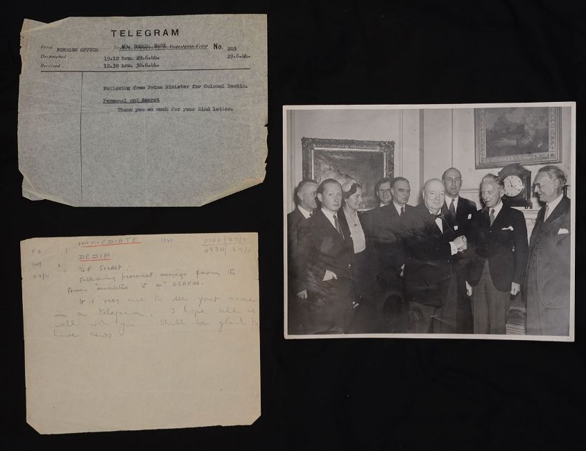 Military and Aviation interest. A signed letter by Major George Herbert "Lucky Breeze" Scott (1888-1930) and telegrams between Winston Churchill and Colonel William Deakin (1913-2005),