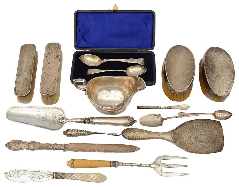 Condition: Sauce boat in good condition. Clothes brushes with distressed bristles and Slight dents and knocks to backs, Other silver items mostly in poor condition and a/f