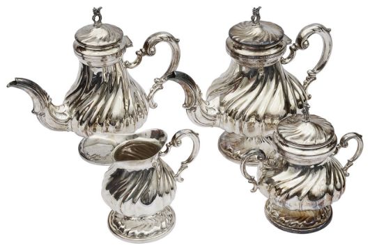 comprising teapot, coffee pot, twin handled sugar basin and cover and milk jug, of each baluster wrythen form, with scroll handles on a domed foot