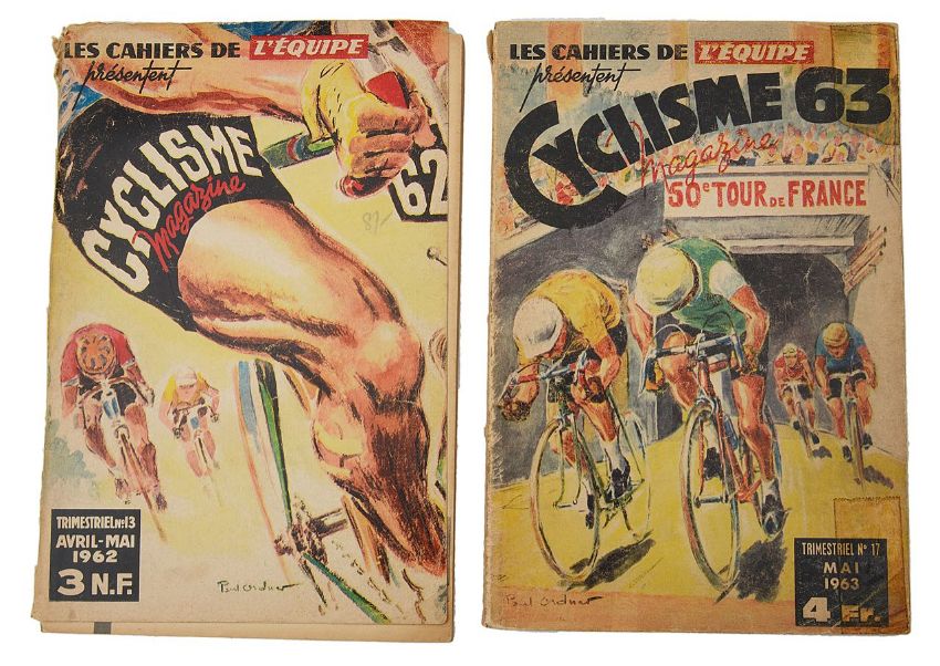 the Tour de France group to include a number of items of press material from recent editions of the race, two French magazines from 1962/3 profiling the race, an early 20th century piece of sheet music entitled 'Le Maillot Jaune', a 1956 Hercules Tour de France themed calendar and a cotton musette from the 2011 Tour de France, the remaining material includes a 1951 handbook for the New Zealand Amateur Cycling Association, a programme and results list for the 1956 Omloop der 9 Provincies, a programme for the 1957 Peace Race (Prague-Berlin-Warsaw), a 1969 fully illustrated 132 page booklet entitled 'Stoleti Cyklistiky' (Century of Cycling) relating to the history of Czech professional cycling, a poster for the Science Museum depicting a man on a penny farthing with the bottom cropped, a number of issues of 'Cycling' magazine dating from 1923 up to the 1970s, Nos. 46-71 (Jan-June 1937) of 'The Bicycle' periodical bound in one volume, a hardback novella entitled 'The Life and Times of Charley Barden' by Dick Swann, a number of pieces of late 19th century sheet music relating to cycling and a 7-inch record of Yves Montand's 'La Bicyclette', and a number of late 19th century French and British magazine covers and pull-outs with cycling themed illustrations, (qty)