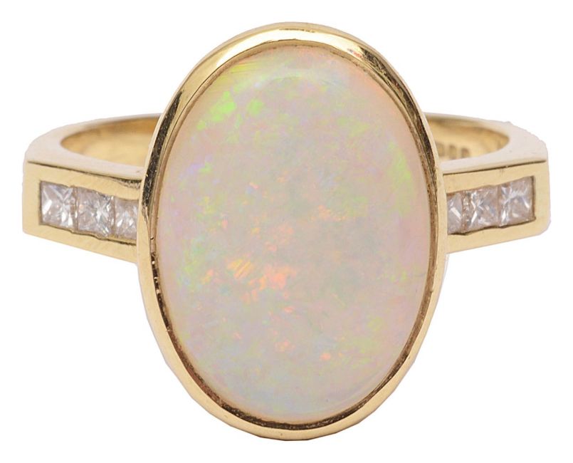 having central oval opal set between princess cut diamond channel set shouldered mount, 18ct yellow gold mount
