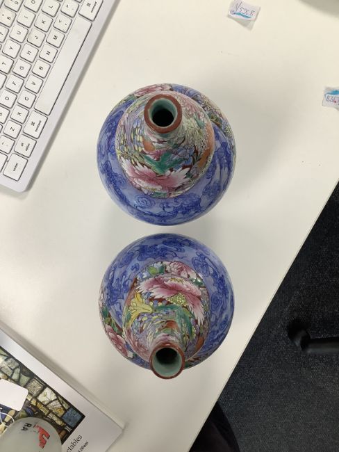 each profusely painted with flowers and tied blue ribbon decorated with bats among clouds on a red ground, blue six character
