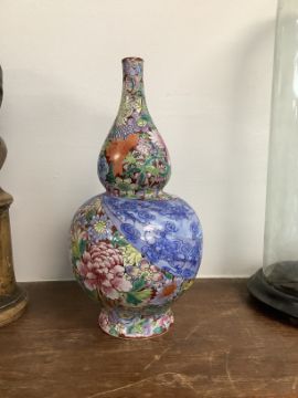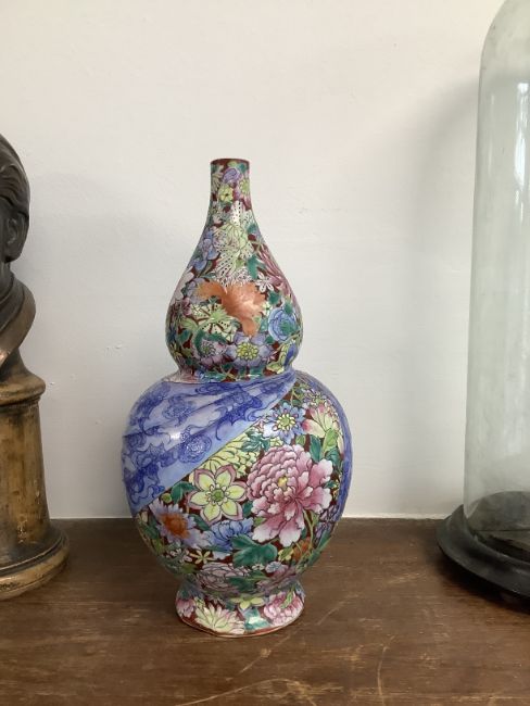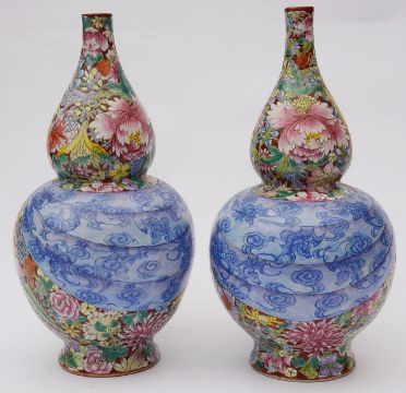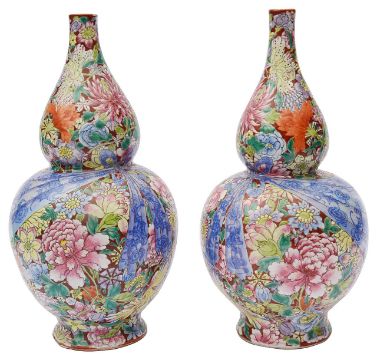 A pair of Chinese famille rose millefleur double gourd vases