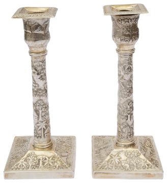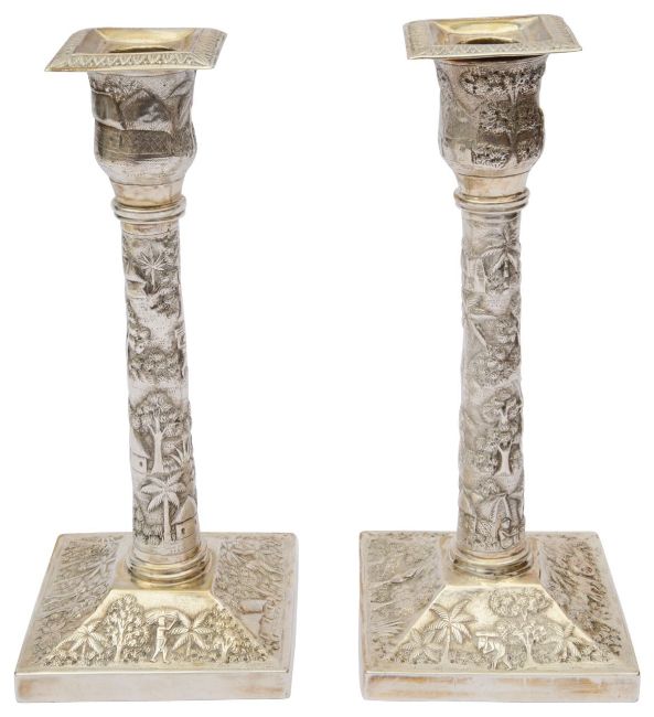 the columns and square swept bases chased with scenes from village life with houses, figures cows, palms and other trees, fitted with square drip pans with a foliate rims, weighted bases, (2)