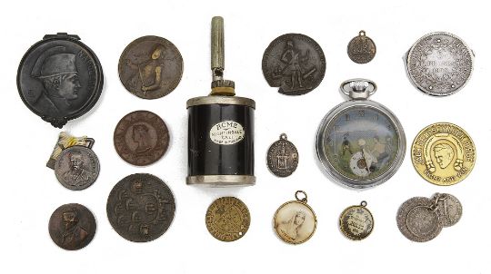 comprising a porcelain patch box mounted with a metal lid cast with Napoleon I in profile and initialled LR for Louis Rault, an Acme Nightingale Call, an Ingersoll chrome pocket watch with football dial, three Admiral Vernon capture of Porto Bello medallions, a Macniven & Camerons Pens token, (drilled), etc, (qty)