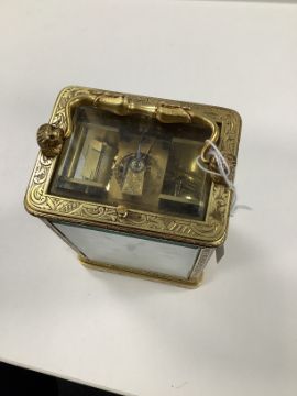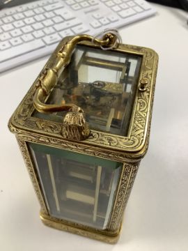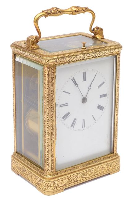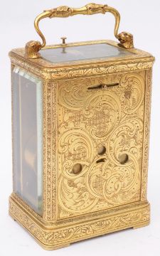 A mid 19th century French engraved gilt brass case carriage clock with push button repeat by Auguste, Paris c.1845