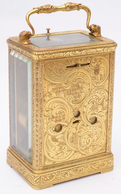 eight day twin barrel bell striking movement, stamped Auguste A Paris, underslung platform duplex lever escapement with helical spring to a compensated bimetallic balance, white enamel dial with black Roman numerals and minute track, blued steel hands, signed Auguste a Paris, engraved bevelled glass multi-pieced case, the rear panel with shuttered winding holes, finely engraved rococo-scroll decoration, lions head pivot lugs for the hinged tied foliate bud handle, on conforming skirt base