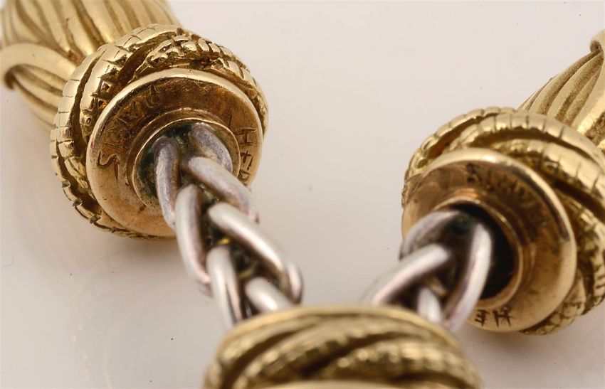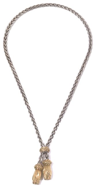 the sterling silver chain with 18ct gold slide and solid 'faux' tassels ends, one tassel with screw thread as fastening, signed HERMES PARIS on each gold tassel, gold and silver French control marks, large brown suede Hermes, Paris case
