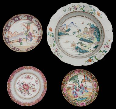 comprising a petal shaped dish painted with figures on a garden terrace by a pavilion, a watery mountainous landscape beyond within a foliate cartouche and diaper border, a plate painted with floral sprays within gilt decorated pink scale borders, a large deep basin a/f with petal edged rim, decorated with a watery landscape with pavilions, and an early 19th century Canton plate painted with ladies in a garden setting, the gilt ground border with butterflies, flowers and fruit, (4)