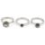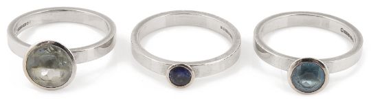 each with collet set circular blue gem of varying colour and size,mounted in 18ct white gold, Birmingham 2008, maker C.P.M. in associated Georg Jensen ring box (3)
