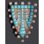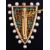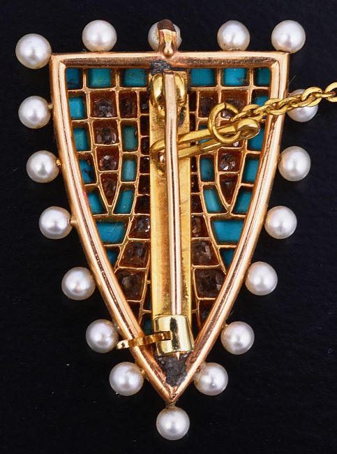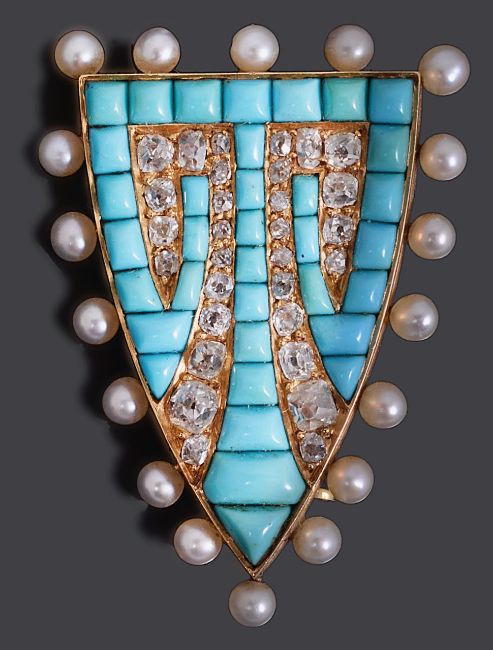A mid Victorian turquoise, diamond and pearl broochthe shield shaped plaque with calibre-cut turquoise forming an stylised 'T' to the old-cut diamond-set background, with pearls applied to the outer edge, mounted in yellow gold, converted from a pendant, together with a fitted leather and gilt tooled case with impressed 'D'length 3.3cm., width at the widest part 2.4cmCondition: Overall condition very good. Four turquoise slightly greener, otherwise well matched. Pearls well matched with good skins and lustre. . case with wear to exterior and interior, and foxing to interior silk