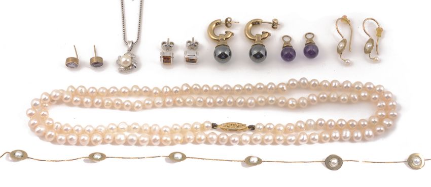 comprising an 18ct white gold cultured pearl pendant on chain, a pair of rectangular 18ct white gold yellow gem set ear studs, a 9ct gold Pia cultured pearl disc necklace and earrings, a pair of 9ct hematite drop earrings with interchangeable gold mounted amethyst drops, a pair of 9ct gold mounted amethyst ear studs and a single row river pearl necklace, all with associated boxes (7)