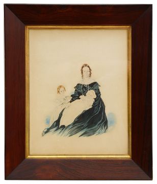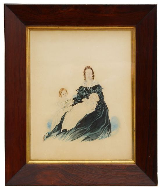 'Portrait of a seated lady in a black dress, a baby in her lap and a young girl by her side', watercolour, unsigned, period rosewood frame with gilt slip