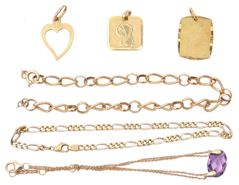 comprising a religious pendant marked 750, a fancy flat link bracelet marked 750, another fancy link bracelet marked 750 with alternating double chased links, an unmarked yellow metal zodiac pendant, a pierced heart pendant, and a gem set bracelet with fine chain marked 750 (6)