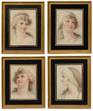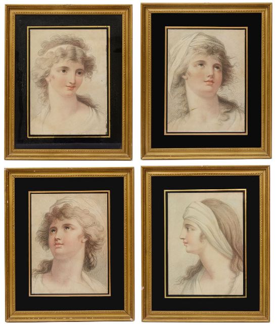 A set of four early 19th century colour stipple engraving portraits of young women c.1810