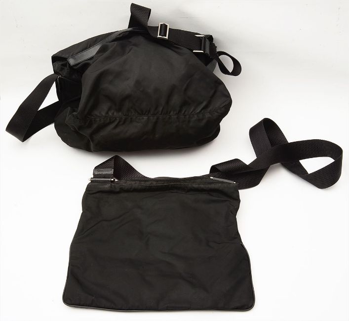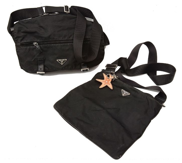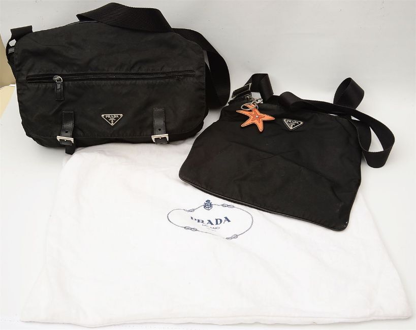 the first with two sections to the front with leather buckles, zip to front and zip to interior and another small zip pocket inside , together with a black woven fabric shoulder bag with orange leather Prada starfish key ring, with single Prada dust bag (2)