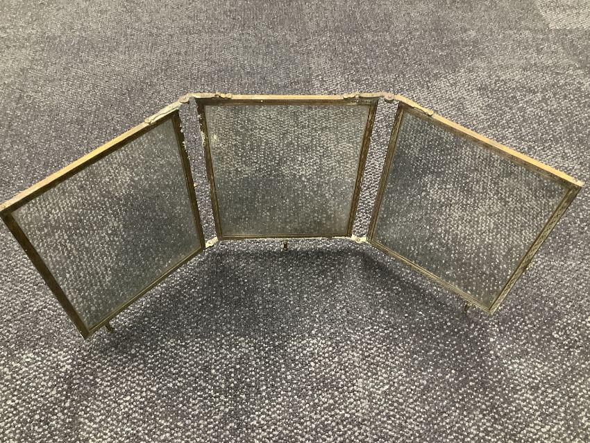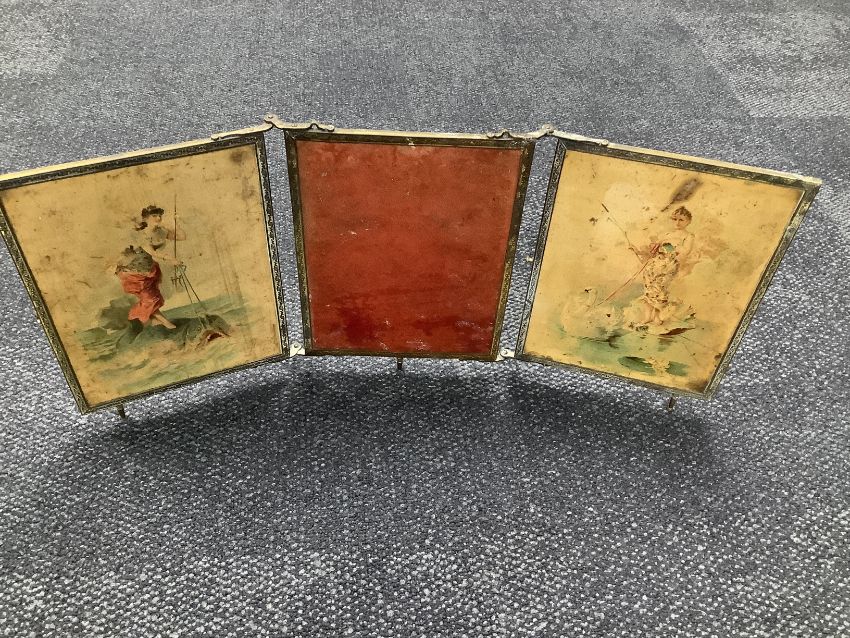 comprising two early 20th century continental oval portrait miniatures, one depicting Frederick the Great, initialled MK, the other a female nude, both in ivory 'piano key' frames together with a Chinese black cloisonnŽ enamel table cigarette box and three matching ashtrays, a late 19th century French folding gilt metal mounted triptych mirror, a Halcyon Days ormolu and crystal pedestal dish and a petit point tapestry minaudiere fitted with contents (qty)