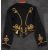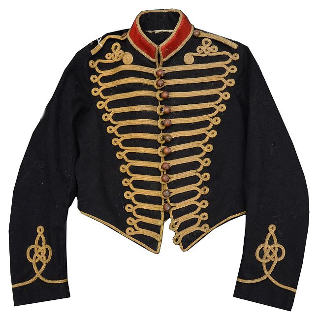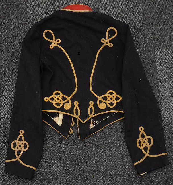 black cloth with red stand collar, the front with fourteen rows of yellow cord frogging and brass ball buttons, knotted cord to cuffs and shoulders straps