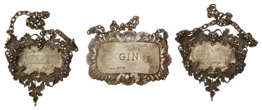 'Sherry' and 'Brandy', with a cast fruiting vine border, suspended on chains, together with label 'Gin' with foliate embosses border, (3)