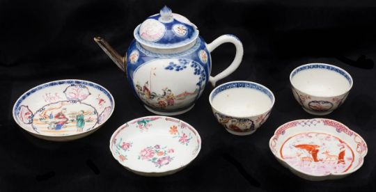 An 18th century Chinese export famille rose porcelain teapot and cover, a lobed teapot stand and tea bowls and saucers