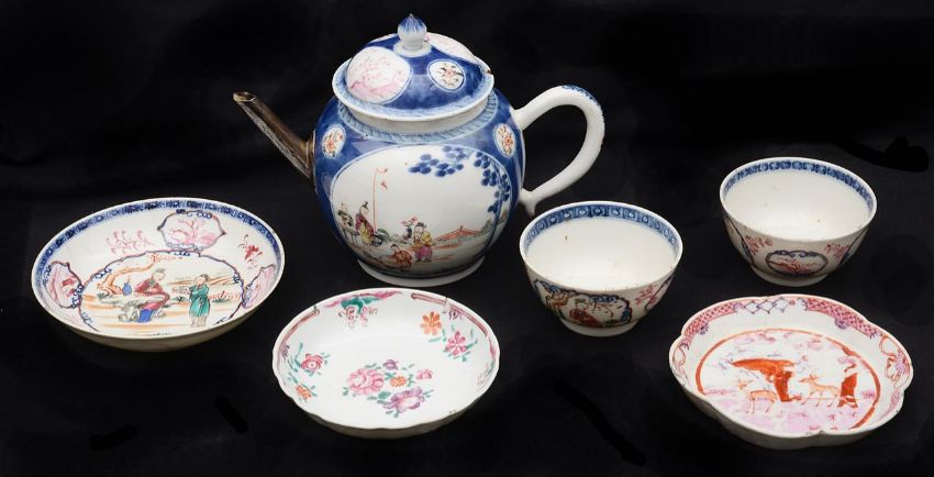 first of globular form, with underglaze blue decorated, each side painted with oval panels containing figures in a garden setting, replacement silver spout, second painted with deer among trees, together with a pair of tea bowls and saucer painted painted figurative panels and undeglaze blue borders, etc., (6)