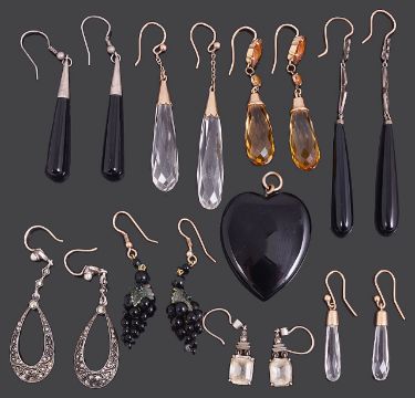 comprising facetted shaded citrine drops, fittings test gold, facetted rock crystal drop earrings and a similar smaller pair, both fittings test gold, a long pair of Art Deco onyx and marcasite drop earrings, fittings test silver, a smaller pair of onyx ear drops, test silver, a pair of Art deco silver and marcasite drops, a pair of silver marcasite and paste drops, a pair of black glass grape drops and a black onyx heart shaped locket a.f. (9)
