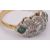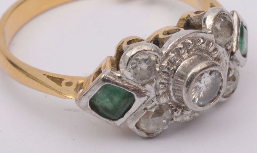 An emerald and diamond ring, the central brilliant-cut diamond collet-set above the ornate surround set with four brilliant-cut diamonds and two calibre-cut emeralds, the tapering shank indistinctly stamped '18ct'ring size OCondition: Overall condition fair/good. One emerald with chip , the other worn.