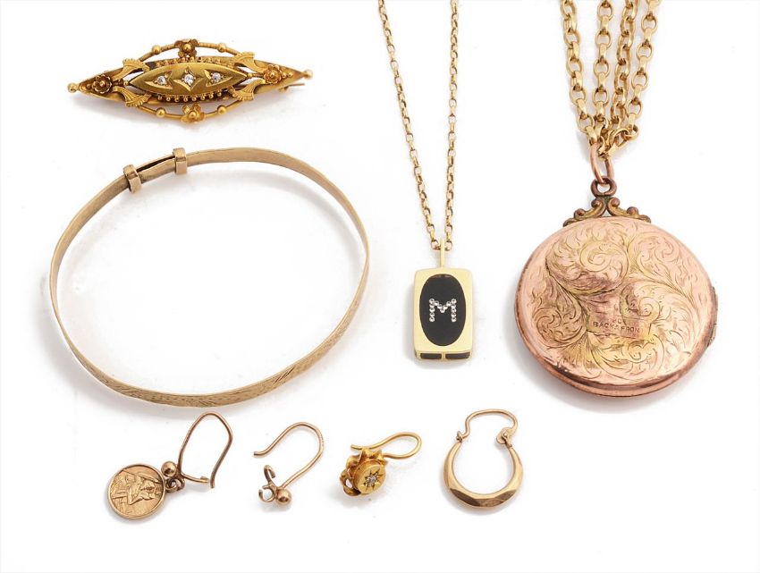 including a Victorian 15ct gold diamond set scroll brooch, a 9ct gold belcher chain, 9ct bangle, 9ct 'M' pendant on chain, three single gold earrings, scroll locket, tests gold back and front, a.f. (qty)