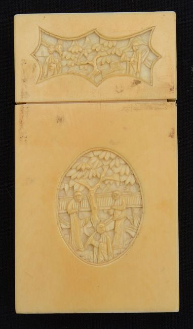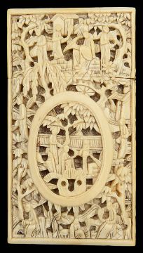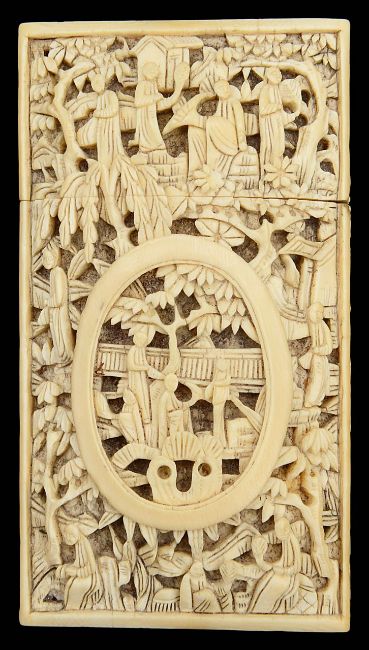 deeply carved with figures amongst trees and lotus, the reverse with carved panels,