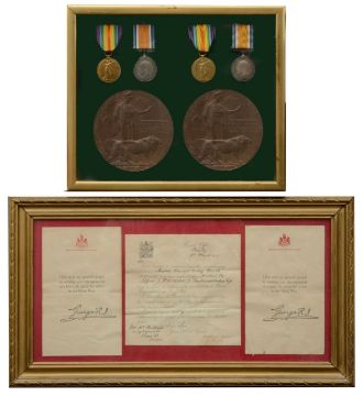 both formed of Victory and War Medals on ribbons accompanied by memorial plaques, in a glazed display case, accompanied by framed named Record Office Enclosure and two Buckingham Palace Enclosures. (2)