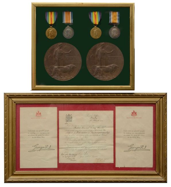 Two W.W.I casualty medal groups awarded to brothers Pte 31236 Alfred John Macdonald Northamptonshire Regt. and WR-205789 PNR H G Ernest Edward Macdonald R.E.