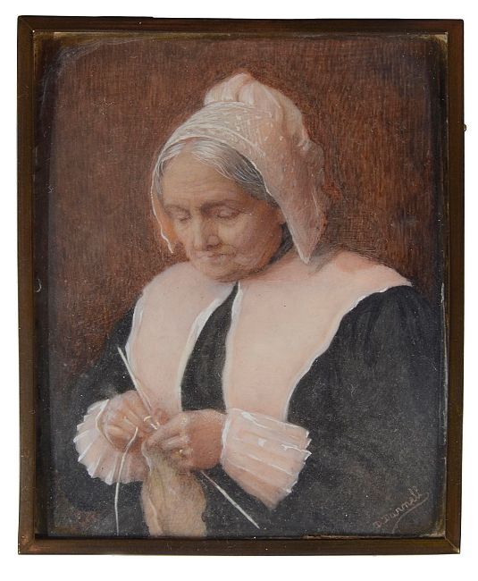 'Poor and Content is rich, and rich enough', Portrait of an old lady knitting wearing a black dress with a white cap, watercolour on ivory signed D Darnell, brass frame with suspension loop, hand written label verso