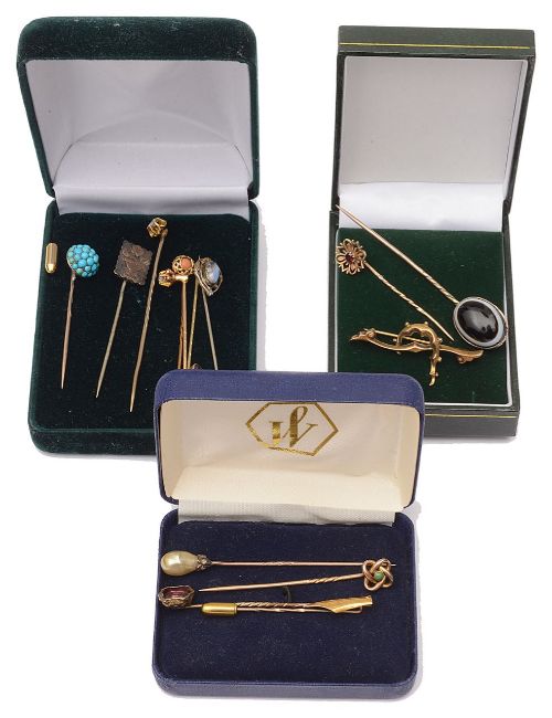 including a Victorian turquoise set pin, a large oval banded agate set pin, test mainly gold, an amethyst, a turquoise and a garnet set pin, all test for gold, an 18ct pen nib pin, , five other various pins and a brooch a.f. (qty)
