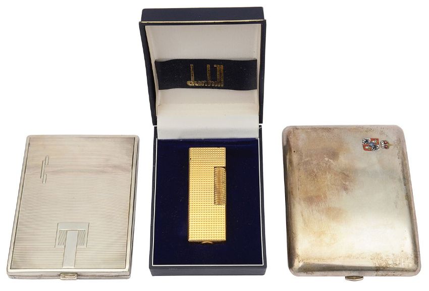 Two Austrian .900 silver cigarette cases and a cased Dunhill gold plated rollagas cigarette lighter