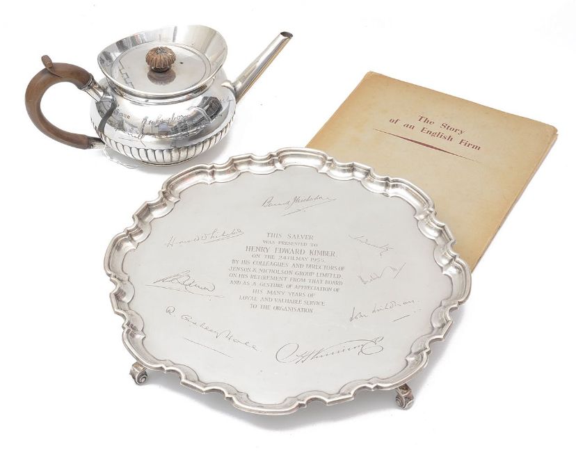 first Sheffield, 1936 by the Atkin Brothers, of circular form with piecrust rim, on scroll feet, engraved with various signatures and presentation inscription This salver was presented to Henry Edward Kimber on the 24th. May 1955 By His Colleagues and Directors of Jenson & Nicholson Group Limited , on his retirement ..., together with a teapot, London, 1923 by Martin Hall & Co. ltd, of circular compressed half fluted design with a broad flared collar, fitted with a fruitwood scroll handle and a fluted knop finial, engraved with various signatures,