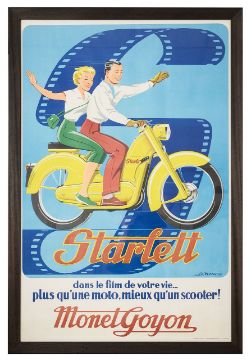 A large vintage French advertising poster for the Monet Goyon Starlett motorcycle,